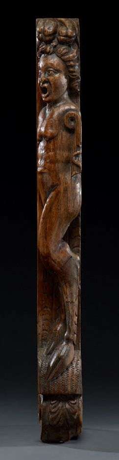 en chêne sculpté représentant un buste de vieille femme à l'expression grotesque sur des pattes de satyre, sa tête suportant des fruits et se tenant sur une agrafe feuillagée, fond de penne.