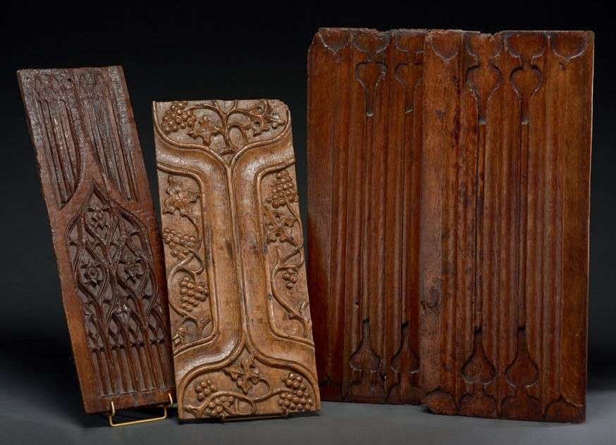 de chêne sculpté à décor de fenestrage gothique, de plis de serviettes et de pampres de vignes. Eléments de meubles anciens.