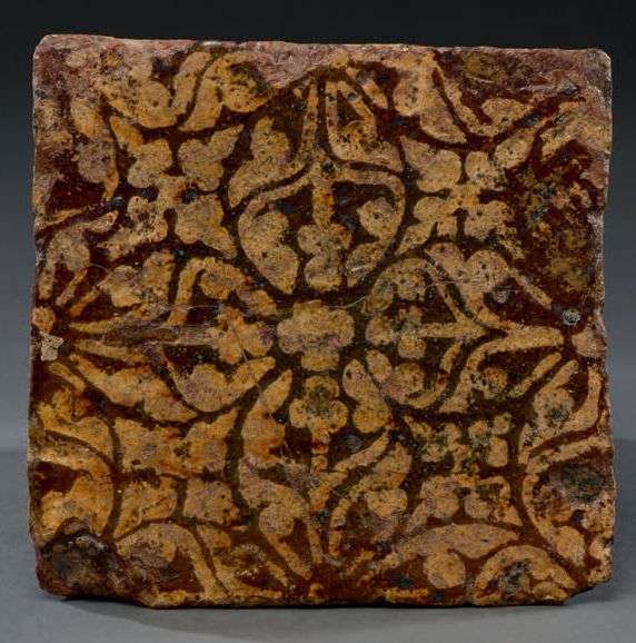 en terre cuite vernissée à riche décor de fleurons beige sur fond rouge brun.