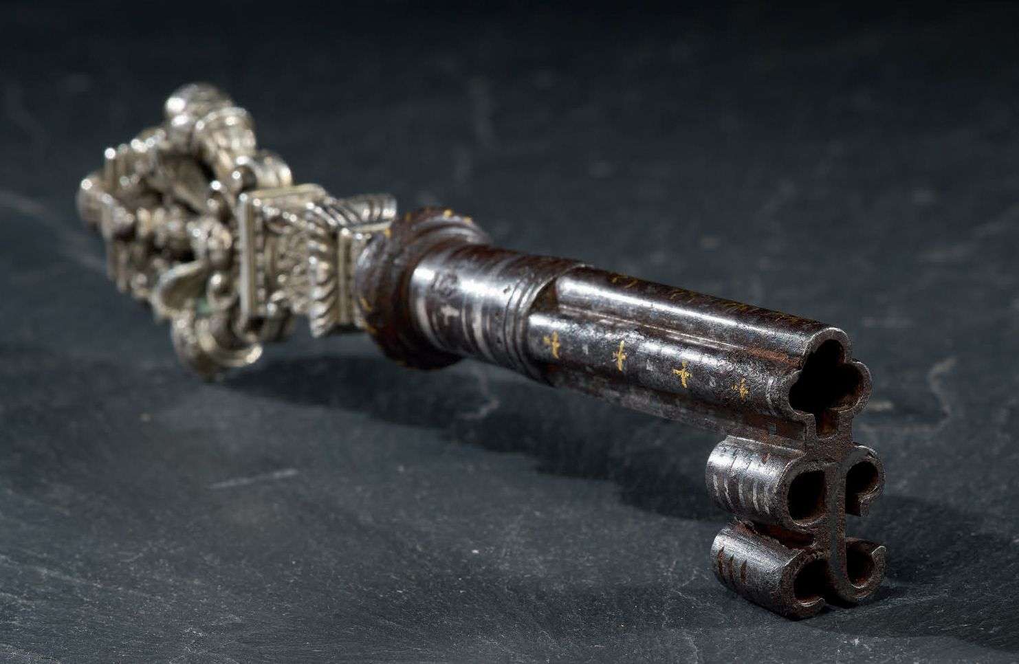 dont la tête est en argent plein richement ouvragé de deux créatures grotesques adossées à un décor architecturé sur une tête de chérubin. La tige est en fer noirci incrusté de fleurs de lys et de croix en or et de points d'argent. Panneton profilé aux initiales JB.
