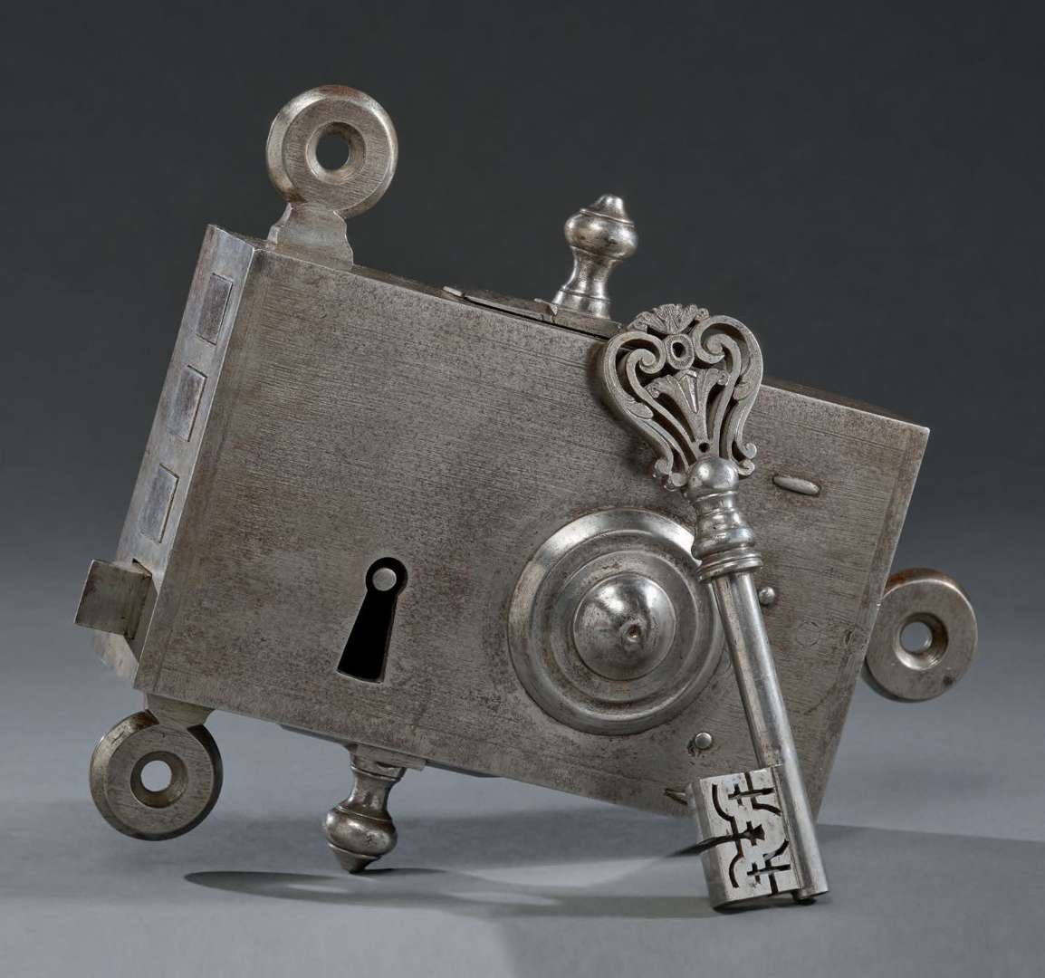 en fer forgé réunissant toutes les fonctions : ouvrir et fermer de l'intérieur et de l'extérieur par la clef actionnant le pêne dormant fourchu, s‘enfermer au pêne demi-tour en claquant la porte, et s'enfermer de plus par le bouton du haut ou «verrou de nuit». Belle clef d'origine finement travaillée.