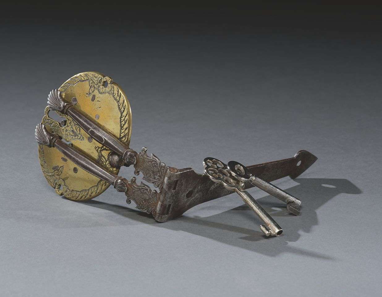 complexe à deux moraillons et ses deux clefs (rapportées). Platine de laiton finement gravé. La première clef libère le moraillon de droite pour dévoiler l'entrée de l'autre clef.