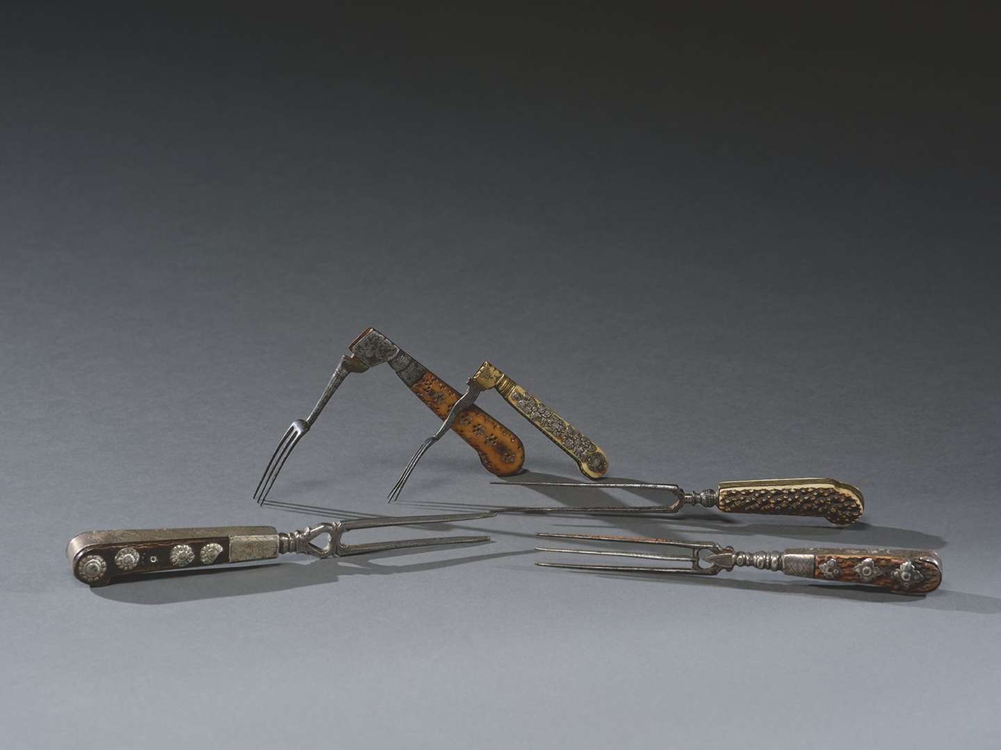 à deux ou trois dents, les dents de fer forgé et les manches en bois de cerf, bois ou os agrémenté d'argent ou de laiton. Deux sont pliantes.
