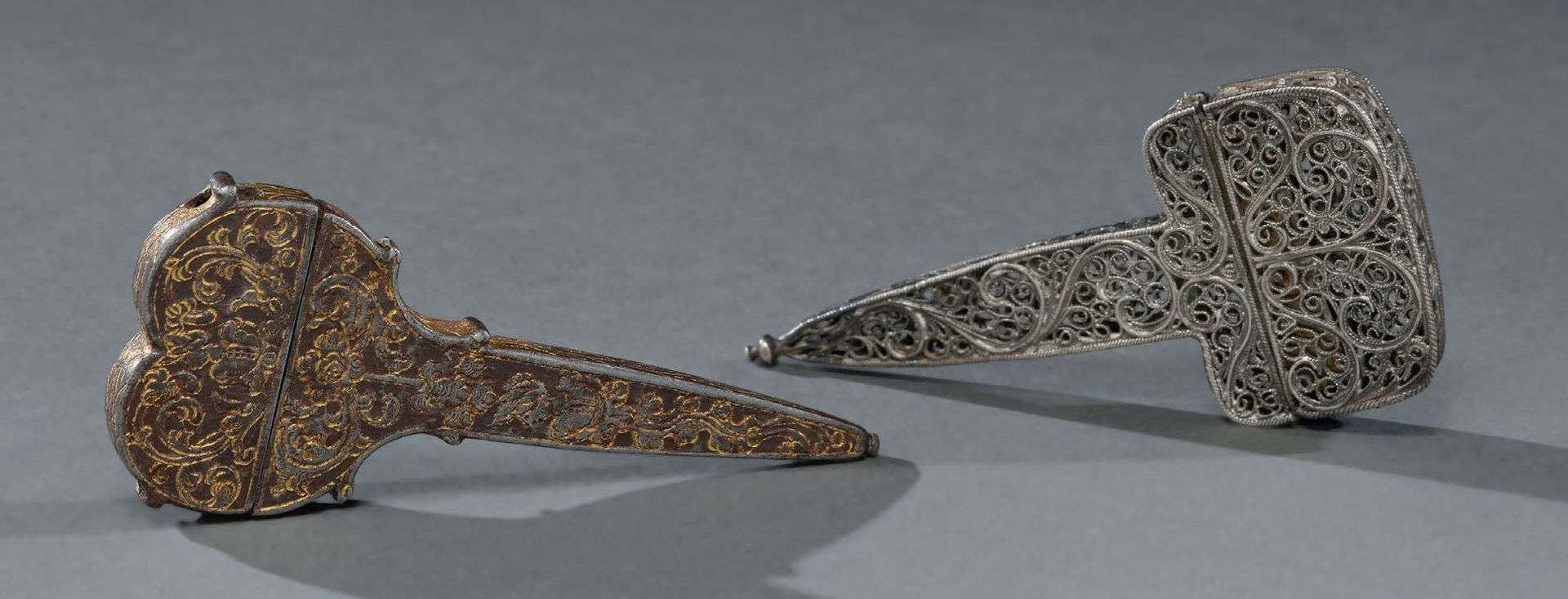 le premier en filigrane d'argent, l'autre en fer noirci niellé d'or jaune.