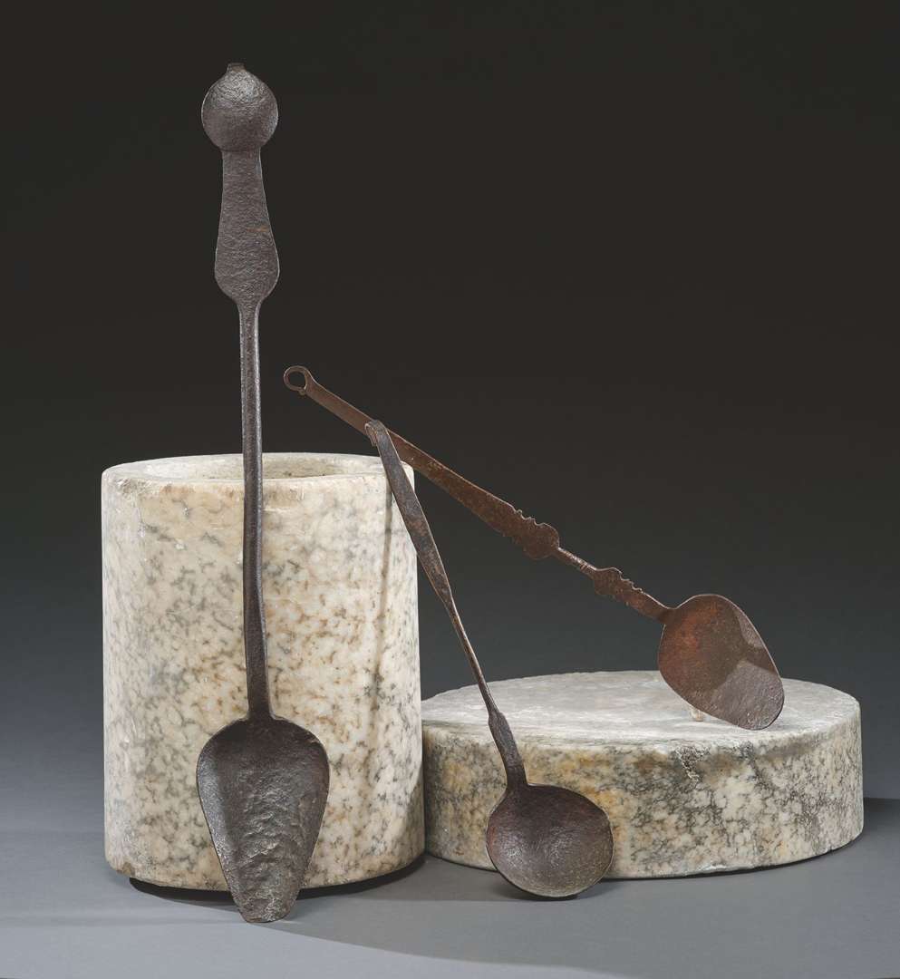 en fer forgé dont deux grandes cuillères à pot et une louche à bec verseur.