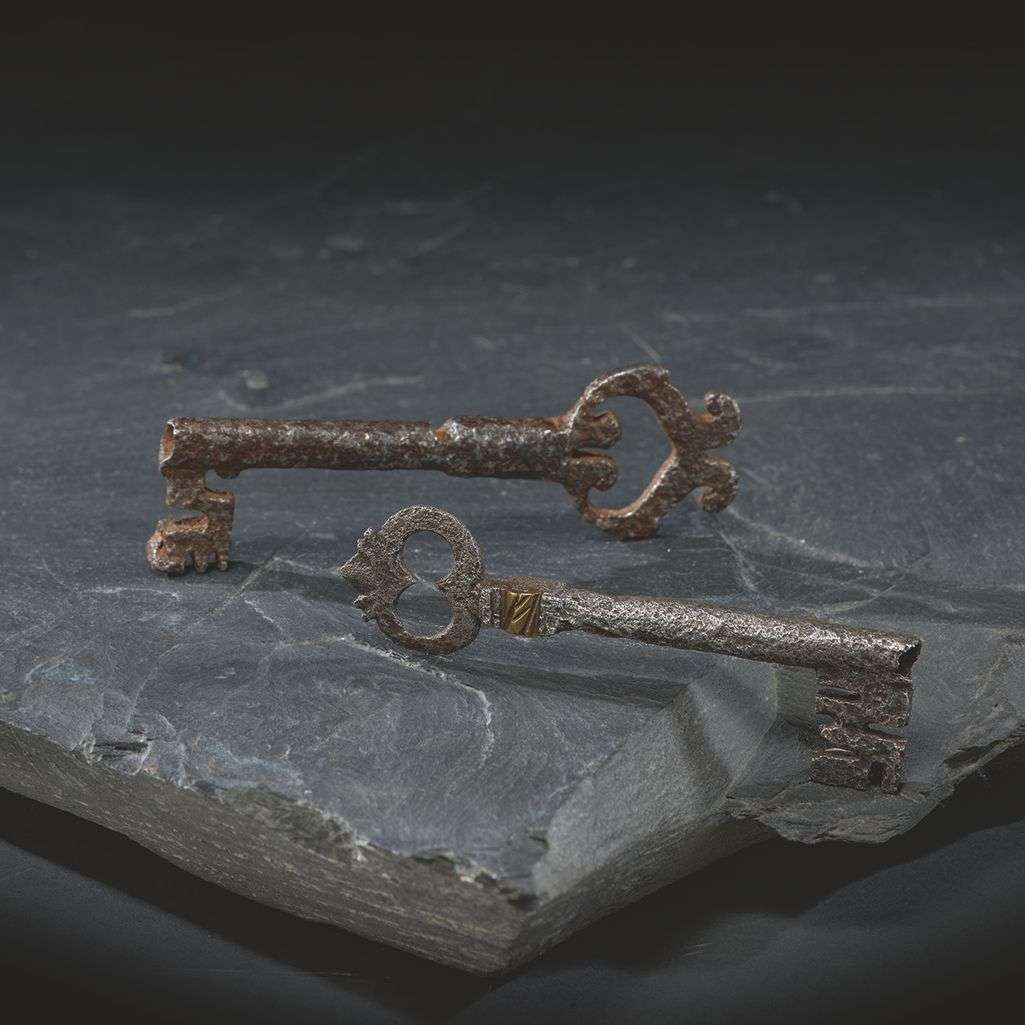 en fer, la tige forée, l'une avec une pièce de laiton sur la bossette. France,