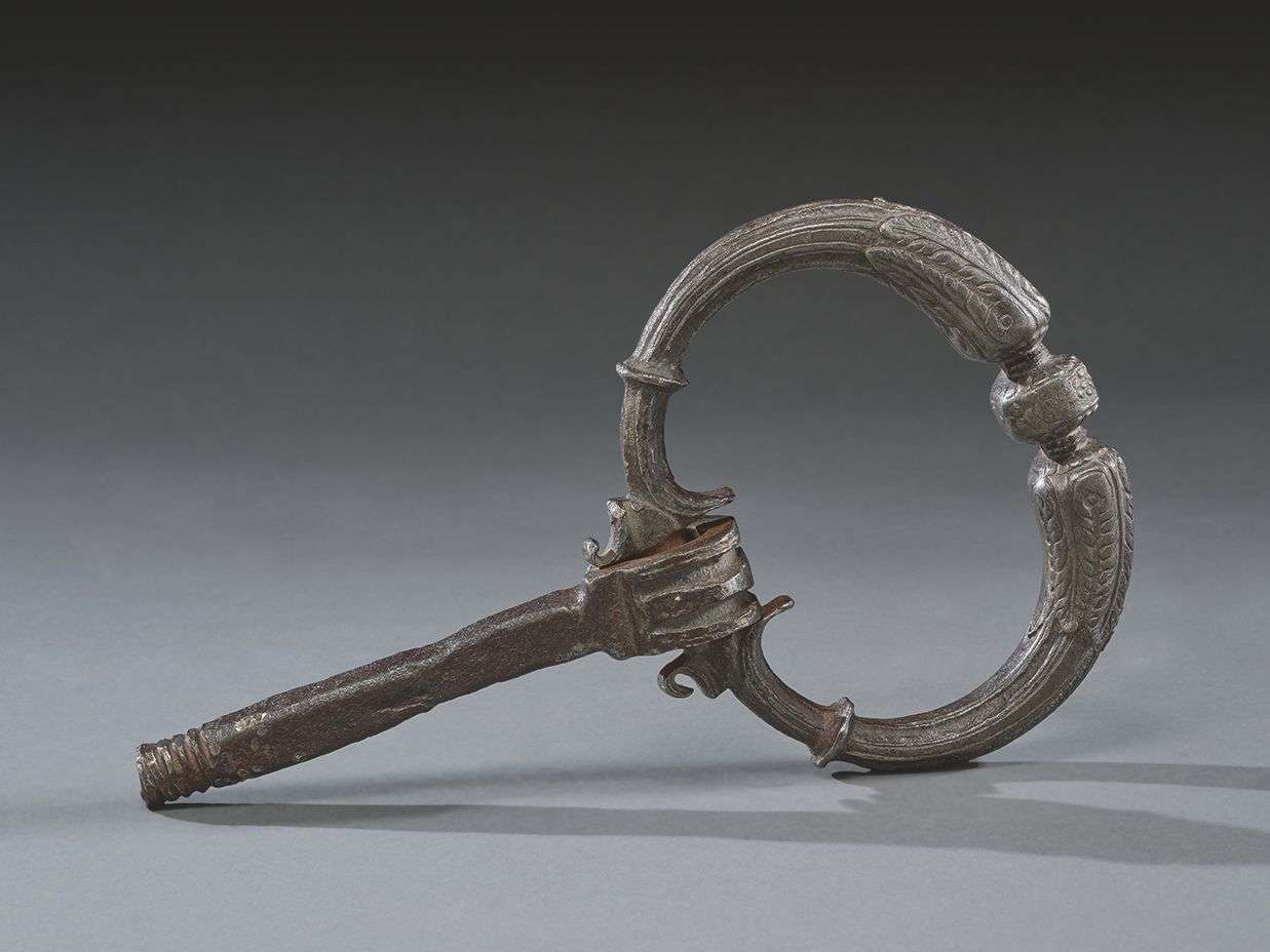 formé d'un anneau de deux balustres affrontées ciselé de pennes, au centre un noeud à godron. Dos plat.