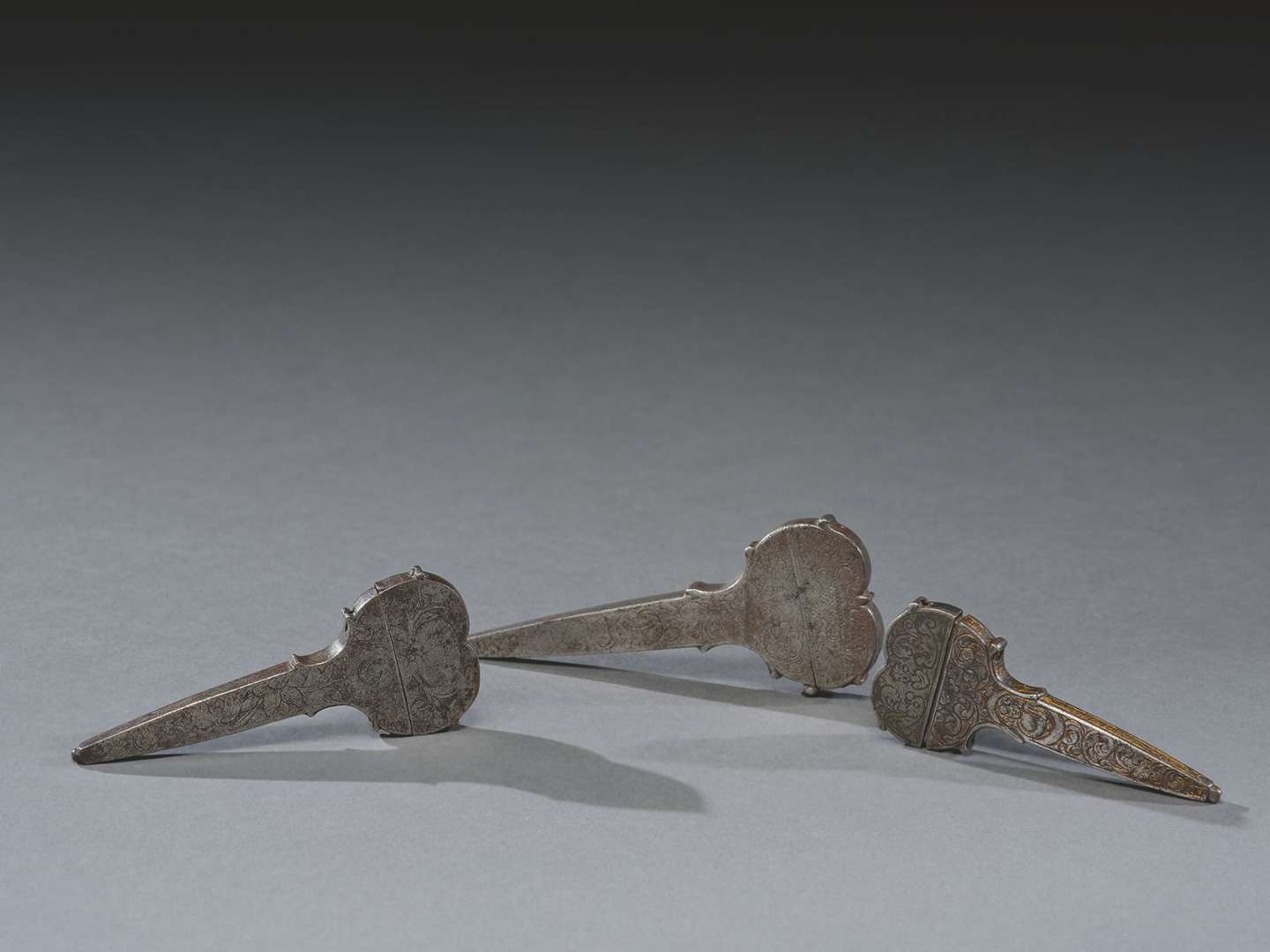 en fer forgé, les faces gravées de fleurs et fruits. L'un à réhauts doré.
