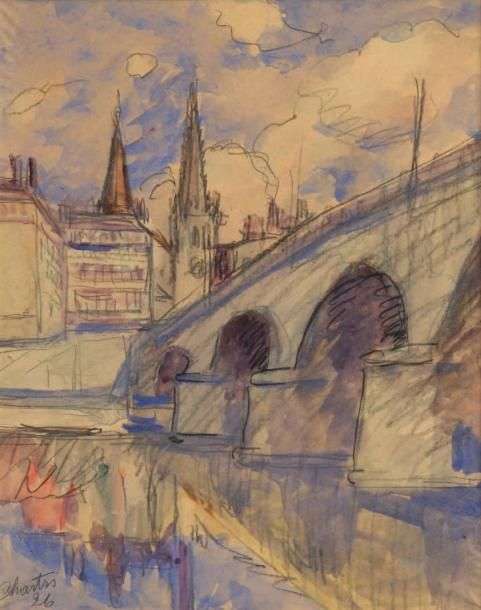 Le pont et l'église de Saint Nizier Technique mixte, signée en bas à gauche 46 x 36,5 cm