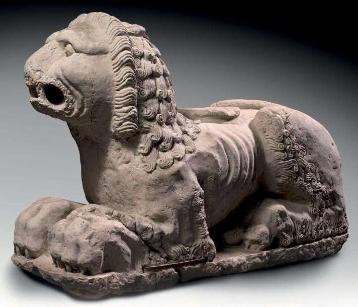 LION STYLOPHORE Pierre calcaire H: 81 - L: 121 - l: 40 cm Italie du nord - XIIème siècle Fentes restaurées et accidents visibles Les lions sculptés trouvent une place de prédilection au portail des églises romanes italiennes, où ils encadrent l'entrée. En Emilie Romagne, en Toscane, et surtout en Lombardie, où ils sont un élément constitutif du portiro, monumental baldaquin de pierre dont les colonnes reposent sur des lions allongés, sculptés en ronde bosse et détachés du mur. Cet extraordinaire lion couché présente de nombreuses similitudes avec les fauves qui encadrent les entrées de la cathédrale San Zeno à Vérone et du Duomo de Ferrare. Dans une position hiératique, le corps est droit, posé sur les robustes pattes repliées et terminées par des griffes acérées bien visibles. Le dos plat pour recevoir la base de la colonne en porte l'amorce. La tête levée présente un mufle aplati, une gueule entrouverte aux canines menaçantes et des yeux arrondis dans des orbites très creusées. La crinière encadre la tête, peignée avec minutie comme une chevelure, et retombe sur le dos de l'animal en boucles régulières à crochets serrés. La fourrure reprend le même motif stylisé, qui suit les pattes, les flancs, la moustache et l'extrémité de la queue repliée sur le dos. La représentation ne manque pas de réalisme, le lion réel n'étant pas un animal inconnu et exotique. Mais elle est avant tout symbolique, image de puissance retenue et de calme vigilant, qui transforme le lion en gardien infaillible du sanctuaire. Ce rôle est établi officiellement par les Actes de la justice épiscopale mentionnés comme "data inter leones", c'est à dire promulgués solennellement à la porte de l'église. (cf. Actes rendus à la cathédrale de Ferrare). L'image lumineuse du lion assimilé au Christ s'impose dès le XIème siècle. Au plein soleil des façades, il est gardien des entrées parce qu'il dort les yeux ouverts: "Le lion qui dort les yeux ouverts, c'est à dire le Christ dans son tombeau: sa forme hu