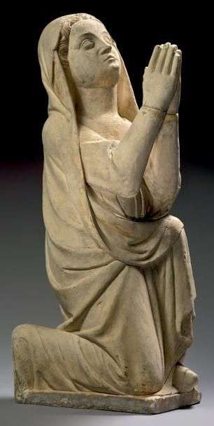 ÉLÉMENT D'ARCHITECTURE: SAINTE EN PRIÈRE Calcaire ourlé d'or Statue: H: 66 cm - P: 27 cm - l: 19 cm France - XIVème siècle Très bel état de conservation Sainte agenouillée, les bras levés et les mains jointes, relève son beau visage et ferme les yeux, dans l'attitude de la prière. Dans sa chevelure ondulée s'accrochent des restes de dorure. Un long voile la couvre, retenu par son genou fléchi, et retombe en plis souples dégageant le pied. Le vêtement sobre, traité par grandes masses, ordonne harmonieusement au plus près du corps les plis aux lignes très pures. Une grande force spirituelle émane de cette représentation singulière, témoignage du haut degré de ferveur de la France médiévale