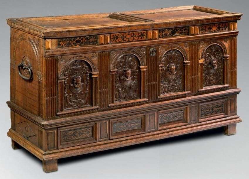 COFFRE D'APPARAT Bois de chêne H: 97 cm - L: 175,5 cm - P: 59 cm Allemagne - XVIème siècle Pieds arrière entés, quelques partie décollées, fentes. Très bel état général L'art de la première Renaissance se déploie avec élégance dans ce coffre d'apparat, solide et équilibré. La façade du coffre s'organise en trois registres soulignés de fortes moulures, comportant chacun quatre travées. Soubassement et entablement accueillent un décor nouveau d'incrustation de bois clair et sombre, qui forme des arabesques identiques pour chaque niveau et alternées. Ce jeu de matière quasi pictural met en valeur l'étage intermédiaire sculpté. Les niches en plein cintre, délimitées par des pilastres et scandées de montants cannelés, s'ornent d'arabesques feuillagées et de cuirs découpés, sur lesquels se posent des médaillons. Au centre, une figure de face en relief très ressorti s'inscrit dans la moulure du médaillon. La variété de détails est étonnamment riche: formes féminines et masculines alternent, tournées vers l'extérieur, indépendantes. Mais l'agencement est ordonné: les figures fonctionnent par couple, gentilshommes barbus et austères, dames de Cour a la longue chevelure ondulée ceinte d'une couronne ou retenue sous une coiffe sévère. L'intensité de l'expression plaiderait en faveur du portrait. Mais les visages des hommes d'une part, des femmes d'autre part sont identiques, visages au front haut et au petit menton arrondi, dans la tradition de l'Ecole de Cologne. Ils imposent des types liés aux thèmes de l'âge ou de la filiation. Il peut s'agir du même couple à deux âges de la vie (couple jeunes/ vieux), des parents et des enfants selon un schéma père/fille, mère/fils, ou de familles de haute lignée unies par les liens du mariage (mariés au centre). Les guirlandes de fruits animant le troisième panneau le laissent supposer. Sur les petits côtés, des poignées rappellent que le coffre a d'abord été conçu pour voyager. La gravure d'un arc retombant sur des pilastres cannelés rap