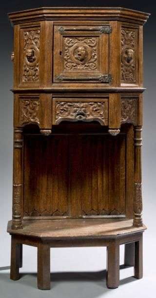 PETIT DRESSOIR À PANS COUPÉS Bois de chêne H: 147 cm - l: 78 cm - P: 43cm Flandres - Début du XVIème siècle Superbe état Véritable meuble bijou, ce tout petit dressoir à pans coupés était destiné, dans les demeures seigneuriales, aux appartements privés et certainement à la chambre. Sa structure est encore marquée par l'esprit médiéval. Sur le socle tenu par six pieds hauts, s'élève le dos qui supporte le corps fermé de l'armoire, couronnée par une discrète corniche. Deux montants antérieurs en forme de colonnes consolident la structure, rappelant que la colonne de bois tournée utilisée dans le mobilier a d'abord été flamande. Son plan à pans coupés défini cinq faces, divisées en deux registres horizontaux. Sculpter le chêne nécessite une grande maitrise, car cette essence est par nature hétérogène, constituée alternativement de zones poreuses et de zones denses. Les deux panneaux à plis de serviette de l'étage d'exposition inférieur relèvent du vocabulaire médiéval traditionnel, avec le motif textile aux échancrures profondes, typiquement flamand, de même que les ferrures cloutées qui articulent le vantail central. Mais l'ensemble des panneaux fait appel au nouveau répertoire venu d'Italie, mêlant arabesques, grotesques et médaillons, interprétés avec un savoir faire et des codes flamands. A l'étage de la ceinture occupé en façade par un tiroir, au-dessus des arcs en accolade moulurés et autour d'un masque de feuilles gothique, se déploient les volutes de tiges zoomorphes qui s'épanouissent en tête de dauphin. Chacun des panneaux supérieurs est centré sur un médaillon, ornement dérivé des médailles et des monnaies qui en conserve la forme circulaire. Chacun des médaillons se place au coeur d'un dispositif de feuillages anthropomorphes, tous différents, mais tous ordonnés selon un axe de symétrie vertical. Plus type que portrait, ces cinq figures très ressorties sont représentées de trois quart face. Elles séparent les hommes des femmes et représentent deux âges de