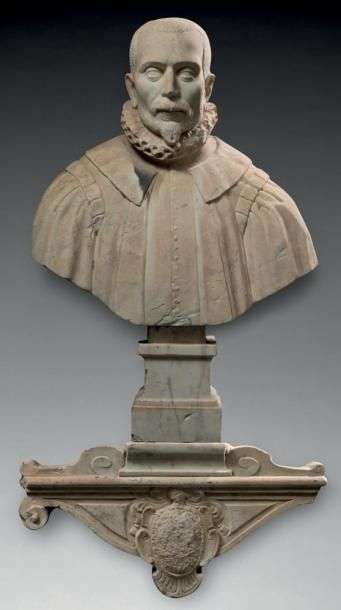 BUSTE DE GENTILHOMME Marbre Buste: H: 66 cm - l: 61 cm Socle: H: 26 cm - l: 77 cm France - XVIème siècle Tête fendue à l'arrière, armoiries buchées et accidents Ce buste sérieux, presque austère a valeur de portrait. Du vêtement traité avec ampleur, se dégage la collerette (fraise) qui cache le cou, formée de godrons réguliers et symétriques. Elle est portée par la noblesse dans la seconde moitié du seizième siècle. Sobre et élégante, elle place l'oeuvre dans les années 1560 ou début de la décennie suivante. L'identité du personnage figurait sur le très beau socle à double console, sous forme d'un blason posé sur un fond de cuir découpé. Ses meubles ont été détruits. Le visage régulier à l'allure noble s'encadre d'un collier de barbe curieusement taillé en pointe. Modelé avec soin, il ne porte aucune trace de l'âge et reflète une intense vie intérieure qui lui confère une exceptionnelle qualité