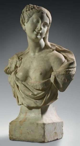 NYMPHE DES BOIS Marbre blanc H: 96 cm - l: 60 cm Italie - XVIIème siècle Très bel état Ce buste ravissant s'enveloppe d'un drapé léger, gonflé par le vent. Sur un long cou flexible s'incline le visage régulier d'une nymphe des bois, d'une étrange douceur. Le dessin en amande des yeux accompagne le léger sourire de la bouche entrouverte. L'arête aplatie du nez prolonge le tracé d'arcades sourcilières à peine marquées. Compagne de Pan, dieu des bergers et des pâturages, des moutons et des chèvres, elle présente la coiffure asymétrique et les oreilles pointues d'une divinité champêtre. Des fruits se mêlent à ses cheveux, un masque d'agneau fixe les plis harmonieusement disposés de son vêtement sur l'épaule, dans le cuir souple et laineux d'une peau de mouton