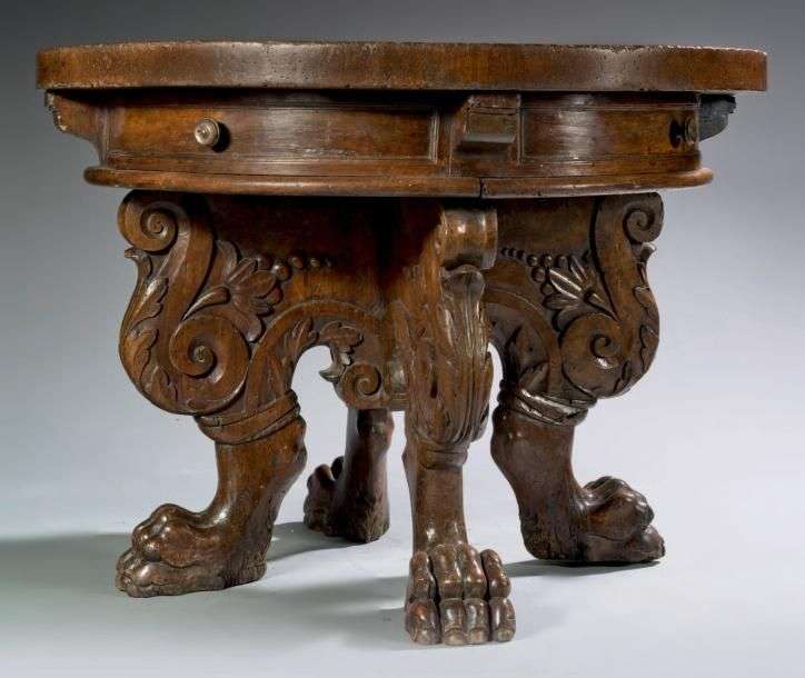 TABLE RONDE Bois de noyer H: 79 cm - D: 109 cm Italie (Florence) - vers 1500 Superbe état d'origine, le plateau a du être raclé anciennement Les modèles antiques en marbre, repris à la Renaissance, inscrivent progressivement leurs formes dans le bois. Cette belle table italienne en constitue un exemple rarissime. Très peu en effet sont parvenues jusqu'à nous dans un parfait état d'origine. Les pieds robustes, mais très élaborés, ressemblent à deux consoles placées dos à dos et sculptées. La forme puissante du lion se mêle à la souplesse végétale de l'arabesque. Cette alliance de base, visible dans les recueils de dessin que les menuisiers réservent à leurs clients, se prête à de nombreuses variations. L'épais plateau circulaire couvre une ceinture à caisson munie de faux tiroirs ornés d'un bouton et séparés par des consoles. Elle témoigne de l'excellence des ateliers qui travaillent le bois à Florence autour de l'an 1500, et se rapproche d'autres meubles qui en proviennent, comme la table de l'ancienne collection Figdor, qui propose un plateau octogonal soutenu par les mêmes modillons. Références: - Collection Figdor, fig. 348 in "Furniture and interior décoration of the Italian Renaissance" frida Schottmuller, New York, 1921 - Livre de modèles d'un artisan. Projet de table, milieu du XVI° siècle. Thornton p. 240 fig. 368
