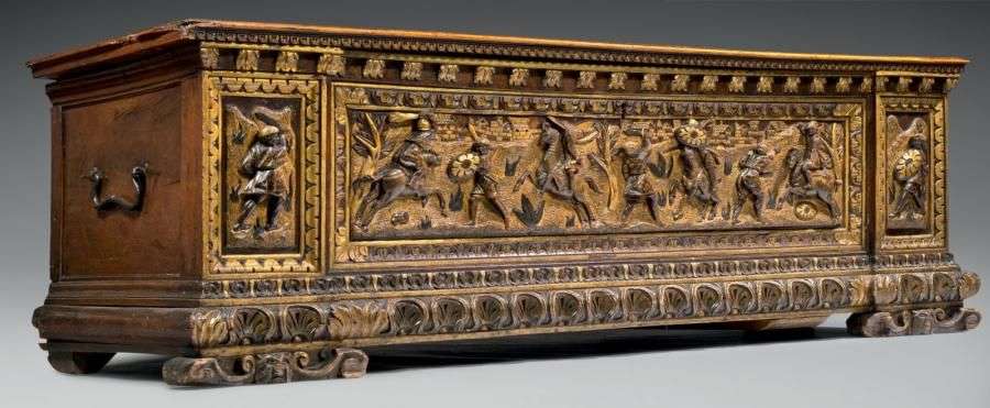 CASSONE VENITIENNE Bois de noyer doré H: 54.5 cm - L: 170 cm - P: 57 cm Italie (Venise) - XVIème siècle Très bel état. Légères restaurations aux fonçures Au XVIème siècle, la cassone est l'indispensable meuble dans lequel la jeune mariée "serre" ses vêtements, ses bijoux et autres ornements de sa toilette. Sa façade est généralement ornée par un panneau décoratif dont la réalisation est confiée à des spécialistes. Celle -ci repose sur des pieds à volutes encadrant un masque léonin. Sa base est sculptée d'une frise de coquille bordée par des raies de coeur. A l'intérieur du panneau central, sont représentées trois scènes de combat entre un cavalier et un fantassin. Ces derniers portent un glaive et un bouclier, alors que le cavalier central est muni d'une lance et les cavaliers aux extrémités, d'une massue. L'événement se déroule sur un fond doré figurant un sol herbeux parsemé de plantes et d'arbres. Utilisant une perspective encore médiévale qui superpose les éléments les plus éloignés, une ville occupe la partie supérieure: maisons aux pierres naturelles et dorées en alternance, tours, murailles, églises s'étendent à l'horizontal sur toute la longueur du panneau. Cette rare cassone a été conservée en très bon état et constitue sans doute le témoignage d'une alliance familiale mettant fin à de nombreux combats entre citoyens de la même ville. Bibliographie: Cette cassone présente des similitudes avec une cassone vénitienne du Musée de l'Ermitage à Saint Petersbourg présentée dans le livre. Cassoni Italiani delle collezioni d'Arte dei Musei Sovietici, Editoriale Umbra, Foligno -Perugia, 1983, P.122