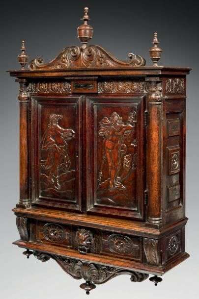 ARMOIRE À SUSPENDRE Bois de noyer H: 112 cm - l: 69 cm - P: 25 cm France (Val de Loire) XVIème siècle Ecole de Fontainebleau Exceptionnel état d'origine L'armoire à suspendre conserve les petits objets précieux. Elle se construit comme une façade de temple, superposant le soubassement à tiroir cantonné de volutes feuillagées, l'étage de la colonnade qui encadre l'ouverture à deux vantaux, et le fronton curviligne enrichi de vases, réplique de la console basse à laquelle sont suspendues des toupies. Motifs végétaux et floraux animent la ceinture et les petits côtés. Un mufle de lion, ressort, occupe le centre du tiroir et tient la poignée d'ouverture. Selon les codes de l'Ecole de Fontainebleau, des cartouches de chêne noirci, rapportés et incrustés, s'inscrivent discrètement sur les panneaux latéraux et la frise de la façade. Architecture et ornements forment l'écrin qui met en valeur les vantaux sculptés de deux dieux olympiens d'une indéniable beauté. Sur des panneaux qui refusent la profondeur et réduisent le paysage à quelques lignes essentielles, les figures d'Apollon et de Minerve s'étirent, accentuées par l'étroitesse des cadres. Les lignes sinueuses règnent, les corps s'allongent sur de petits visages, les formes compliquées créent un idéal de beauté détaché du réalisme. Sophistiqué et précieux, l'art de Fontainebleau est un art de Cour. Beauté nue, Minerve s'accoude gracieusement au rocher au pied duquel est déposé son bouclier, frappé du masque de la Gorgone. Elle porte le casque et la lance, attributs de ses vertus guerrières. Déesse de la guerre, de la paix et de la sagesse, elle fait couple avec une divinité masculine représentée comme un éphèbe à l'abondante chevelure couronnée de chêne, il présente la corbeille de feuilles et de fruits, symbole du renouveau de la nature dans le cycle des saisons. Chaussé de sandales, il se drape dans un voile qui cache sa nudité. On doit la primauté des sujets mythologiques et de l'ornement aux artistes italiens de l'