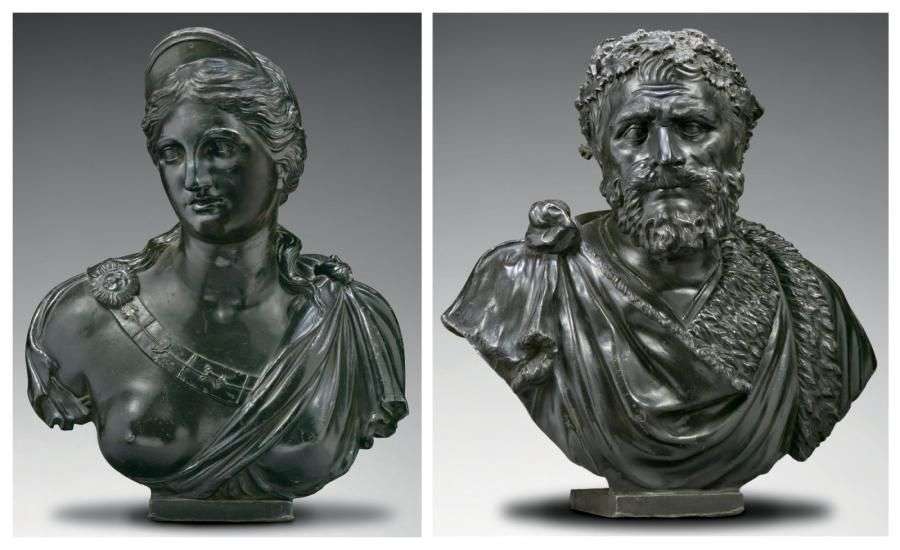 DEUX BUSTES ALLÉGORIQUES Plomb Figure féminine: H: 66 cm - l: 54 cm - P: 32 cm Figure masculine: H: 66 cm - l: 67 cm - P: 24 cm France Fin du XVIIème, début du XVIIIème siècle Superbe état. Trace d'une signature Si le Grand Siècle est un siècle noir, il se place aussi sous le signe de la lumière. Les sciences, dont l'astronomie, connaissent un tel engouement que les Cours d'Europe accueillent des savants et participent à l'avancée des connaissances. La production artistique s ?empare de ces sujets: ces deux bustes magnifiques en portent témoignage. Ils personnifient les solstices, ces deux moments de l'année où "le soleil s'arrête" dans son mouvement apparent. L'été prend les traits d'une femme jeune, dont le buste dénudé est ceint d'un cordon qui représente le plan de l'écliptique et porte les trois signes du zodiaque qui suivent l'équinoxe de printemps: Taureau, Gémeaux et Cancer. Le soleil personnifié et couronné de rayons se situe à l'apogée de sa course, le 21 juin, jour du solstice d'été. Le buste est puissant, les drapés fluides. Le visage ovale et lisse a les traits réguliers, le nez droit, la bouche charnue, et s'encadre d'une chevelure ondulée divisée par une raie médiane et retenue par un diadème. Un homme âgé prête ses traits au solstice d'hiver. Son habit est bordé de fourrure et ses cheveux ceints d'une couronne de feuilles de houx. Pendant les Saturnales, les Romains avaient coutume d'offrir des cadeaux garnis de houx. La célébration de Saturne, dieu des semailles, coïncidait avec la fin des activités agricoles et le solstice d'hiver. Les traits tirés, le front marqué de rides, les sourcils froncés et les pommettes saillantes confèrent au visage une certaine grandeur réaliste, et rapproche l'allégorie du portrait. Ces deux bustes s ?inscrivent dans une veine antiquisante, très en vogue sous le règne de Louis XIV, au même titre que le rythme des saisons et l'exaltation du soleil. Les sculptures de plomb sont généralement réservées aux jardins, bosquets