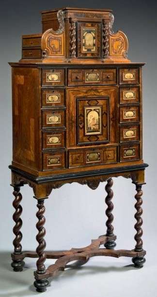 CABINET Bois de noyer, ébène et bois noirci, placage de paesina et de pierres dures H: 204 cm - l: 92,5 cm - P: 50 cm Allemagne - XVIIème siècle Etat exceptionnel Le cabinet date de la Renaissance, sous la forme d'un coffre à compartiments portatif, avec ou sans support, réceptacle de "joyaulx à grandz tas" (Gilles Corrozet) ou meuble à écrire renfermant une correspondance personnelle et intime. Cette armoire du secret nait en Italie, très vite adoptée par les voisins européens, France, Espagne, Allemagne ou Flandre, où elle conserve sa parure précieuse et sa vocation de meuble fort. L'Allemagne du sud, sous influence italienne, devient un centre de production important de ces meubles à décor luxueux, qui associent la paesina, "pierre de Toscane", aux placages de bois fruitiers et exotiques. Ce cabinet d'exception est intact. Il possède sa base, table portée par quatre pieds torsadés reliés par une entretoise chantournée en X. L'usage du bois de noyer et des filets de bois noirci fonde l'unité du meuble. Le cabinet proprement dit ordonne avec symétrie et mesure les dix tiroirs latéraux, et les deux tiroirs qui encadrent le vantail central. L'entablement répond au même principe, avec vantail central cantonné de deux colonnettes torses qui rappellent le piètement, et encadré des consoles qui masquent les tiroirs à ouverture latérale. Chaque panneau de façade emboite des cadres très fins de bois noir et brillant autour d'un tableau de paesina. Ces "pierres paysages" proviennent de la région de Florence, variété de calcaire dans laquelle les accidents géologiques ont créé une fantaisie naturelle de couleurs variées et de veines qui évoquent les lignes d'un paysage, l'inflexion d'un arbre ou la silhouette d'une architecture, donjon, église, village... Assemblées pour créer des tableaux et retravaillées par incrustation de pierres dures, ces plaques de paesina proposent des compositions limpides toutes différentes, aux teintes douces, aux formes géométriques et aux lignes