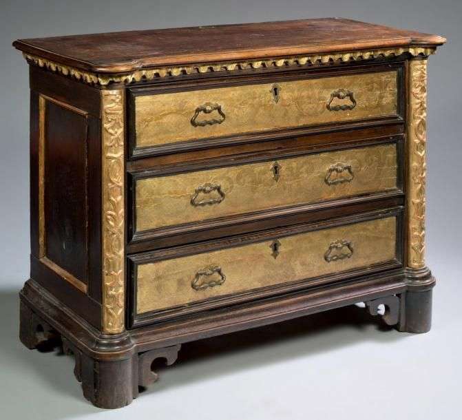 PETITE COMMODE Bois de noyer, bois noirci et dorure H: 95 cm - L: 110 cm - P: 54 cm Italie (Emilie) - XVIIème siècle Fentes restaurées sur les tiroirs. Superbe état Meuble bijou, cette petite commode?présente une architecture dépouillée et une grande richesse de matière et de décor. Les trois tiroirs fermant à clé sont cantonnés de colonnes engagées qui prolongent les pieds en quart de cercle. La plinthe et le plateau en épousent l'arrondi. A la couleur chaude du noyer, soulignée de moulures de bois noirci, s'opposent les surfaces de stuc doré et peint, couvertes d'arabesques. En relief sur les montants, elles sont gravées sur les tiroirs et les festons qui soulignent la bordure du plateau