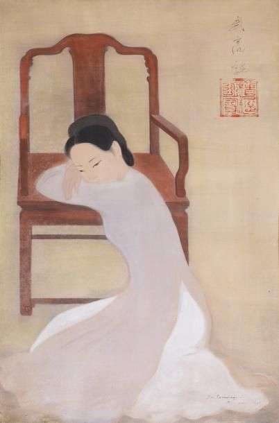 Portrait de jeune femme accoudée, 1941 Encre et gouache sur soie, signée, datée et dédicacée «en hommage à madame Niret» en bas à droite, signée et marquée du cachet de l'artiste en haut à droite 89.5 x 59.5 cm - 351/4 x 231/2 in. Ink and gouache on silk, signed, dated, and dédicated lower right, signed and marked with the artist's stamp upper right