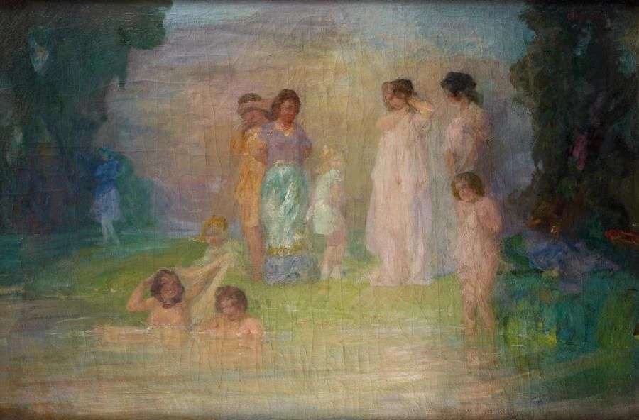 Au bord de l'eau Huile sur toile, signée en haut à droite 97 x 146 cm - 38 x 571/2 in. Oil on canvas, signed lower right Provenance: Collection privée, France Pavel CHMAROV Né en 1874 en Russie, il intègre l'Académie impériale des Beaux-Arts et l'atelier de Répine en 1894. En 1899, il obtient une médaille d'or lui permettant de voyager en Europe entre 1900 et 1905. A son retour, il obtient de nombreuses commandes officielles et réalise aussi bien des portraits de la famille impériale que des paysages ou des scènes d'histoires. Il est élu à l'académie des Beaux Arts en 1916. La Révolution d'Octobre le pousse à s'expatrier et il s'installe définitivement à Paris en 1924. La nostalgie de la mère patrie ne l'abandonnera pas et il ne cessera de peindre des paysages peuplés d'ondines russes aux couleurs lumineuses teintées d'impressionnisme. Portraitiste reconnu, il s'adonne avec autant de réussite à la peinture de paysage qu'à celle de la nature morte. Dès 1928, il réalise sa première exposition personnelle à la galerie Charpentier. Les oeuvres que nous vous proposons illustrent bien l'un des thèmes récurrents de l'artiste: la femme (ou la nymphe) au bain ainsi que sa gamme chromatique colorée et lumineuse. Elles sont également fidèles à sa volonté d'obtenir un rendu s'approchant au maximum de celui de l' aquarelle bien qu'employant de la peinture à l'huile. Nous retrouvons ici l'art raffiné et lumineux d'un artiste élégant dont les peintures semblent célébrer la douceur de vivre. Born in Russia in 1874, Chmarnoff joined the Imperial Academy of Fine Arts and Repin's studio in 1894. In 1899, he won a gold medal allowing him to travel to Europe from 1900 to 1905. Upon his return he obtained numerous official commissions and executed portraits of the imperial family alongside landscape and history paintings. Chmarov was elected to the Academy of Fine Arts in 1916. The October Revolution led him to leave the country and he settled in Paris permanently in 1924. Nostalgia for
