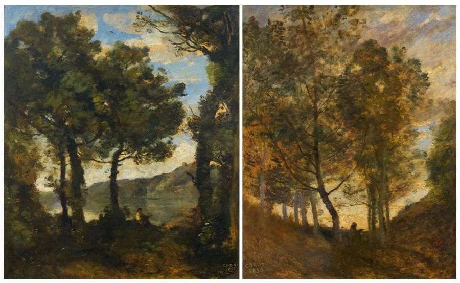 Matinée au bord d'un lac, 1855 Coucher de soleil après l'orage, 1856 Deux huiles sur toile formant pendants, chacune signée et datée en bas 107 x 93 cm - 42 x 361/2 in. 107 x 85 cm - 42 x 331/2 in. Two oils on canvas, signed lower Bibliographie: Ces oeuvres sont citées et reproduites dans l'oeuvre de Corot par Albert Robaut, ed fleury, Paris 1905: tome 2, pp 374-375 sous les n°1186 et 1186 bis Provenance: Collection Nicolas Fournier, 1855 et 1856, peint sur place dans sa propriété par l'artiste Collection Monsieur Cyrot, vers 1898 Vente Urion 16 mai 1934, Paris Collection Damidot Vente Dubernet Douine, Paris, 11 avril 1946 Collection particulière, France, resté dans la famille depuis 1946 COROT Né en 1796, Corot suit une formation classique, passant successivement dans les ateliers d'Achille Michallon et de Jean-Victor Bertin qui l'encouragent à peindre sur le motif et l'incitent à travailler en forêt de Fontainebleau. De famille aisée, il sillonne l'Italie une première fois entre 1825 et 1828, avant d'y retourner en 1834 et 1843. Il s'intéresse également aux paysages français, parcourant notamment l'Auvergne et la Provence, la Normandie, la Bourgogne et la Bretagne. Selon la formation classique, il s'intéresse aux paysages mais dans l'optique de compositions à sujets historiques. Ainsi, il expose au Salon en 1835 «Agar dans le désert», et par la suite soumettra au public, aussi bien des compositions religieuses que mythologiques. A partir des années 1850, sa notoriété ne cesse de croître et sa peinture cède de plus en plus la place à des paysages «rêvés» transfigurés par l'émotion du peintre. En 1846, il est fait Chevalier de la Légion d'Honneur, et officier en 1867. Célébré par ses amis et de nombreux artistes, il est unanimement adulé par la postérité: «il est toujours le plus grand» (Edgar Degas), «il y a un seul maître, Corot» (Claude Monet). Bien que resté célèbre pour ses paysages, il fut également un portraitiste talentueux et de grands artistes comme Mary C