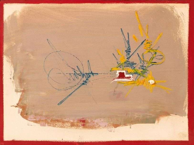 Composition sur fond crème à motifs jaune, bleu, rouge et blanc, dans un encadré rouge Huile et technique mixte sur papier canson 42 x 56.5 cm - 161/2 x 221/4 in. Oil and mixed media on Canson' paper Provenance: Collection personnelle de Madame Georges Mathieu