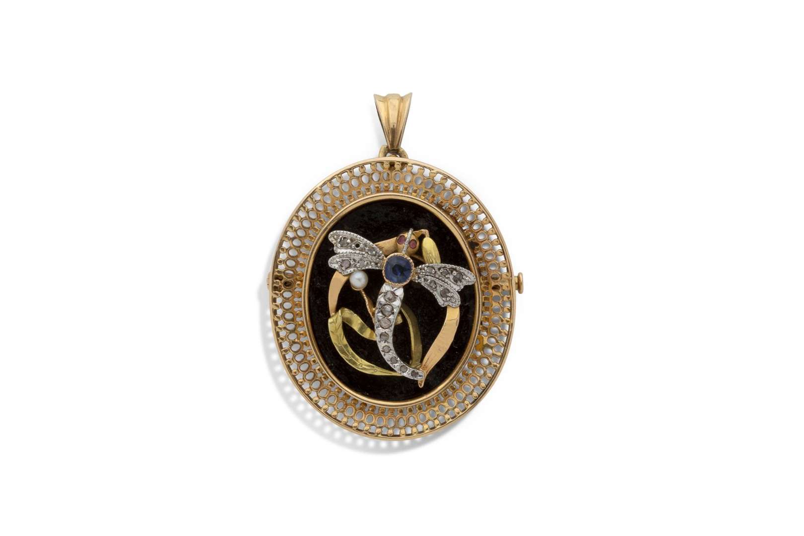 Onyx, diamants taille-rose, saphirs, perle et rubis