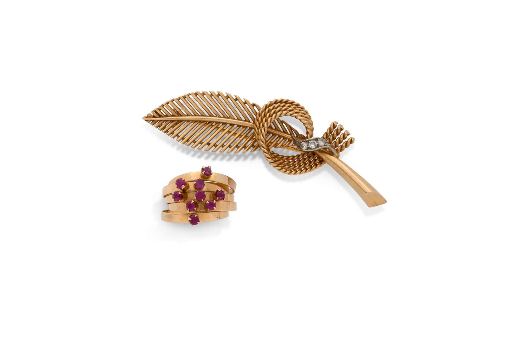 - Broche "Feuille", diamants et or 18k (750). Travail français. H. : 7cm env. - Pb. : 11.2 gr