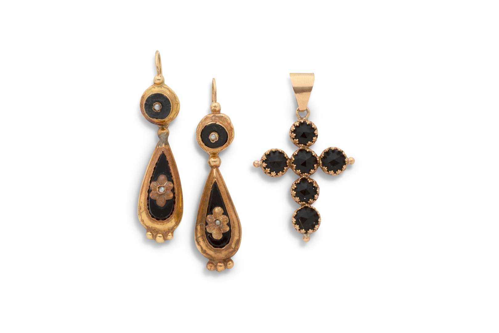 - Paire de pendants d'oreilles "Napoélon III", onyx, perles et or 18k (750). H. : 5 cm env. - Pb. : 4.5 gr
