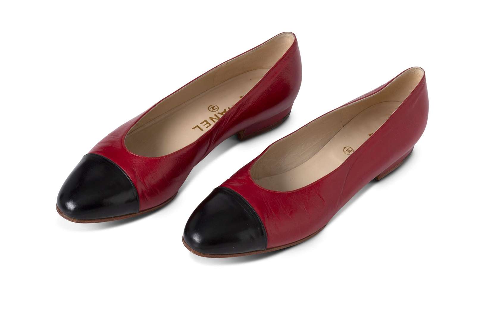 Paire de ballerines en cuir rouge à bout noir.