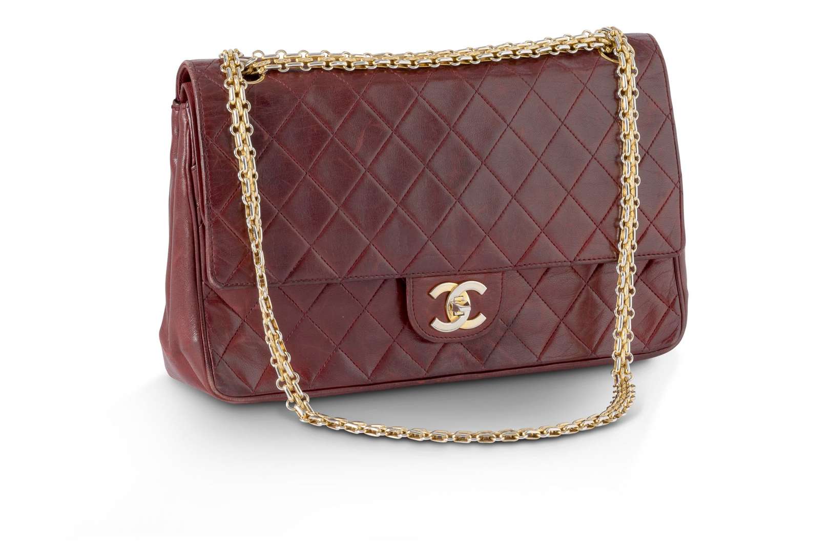 Sac en cuir matelassé bordeaux. Anse-chaine porté épaule ou main. Garniture en métal doré.