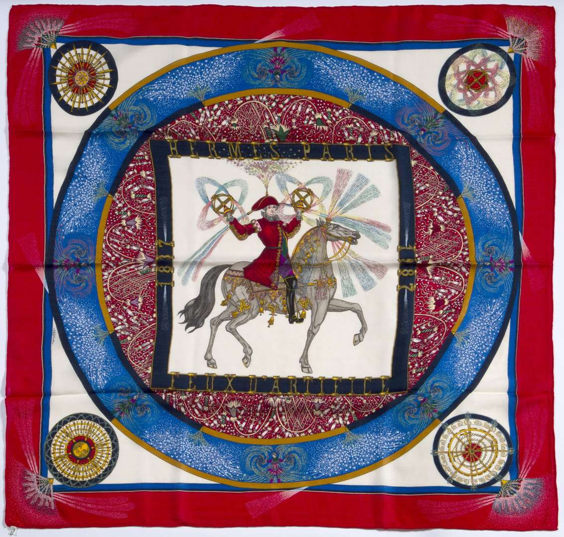 Carré en cachemire et soie dessiné par Michel Duchene, dans les tons de rouge et bleu.