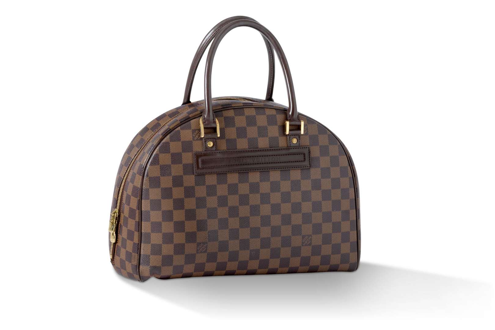 Sac en cuir marron damier, double-anse porté main en cuir marron. Garniture en métal doré. Une poche plaquée à l'avant du sac.