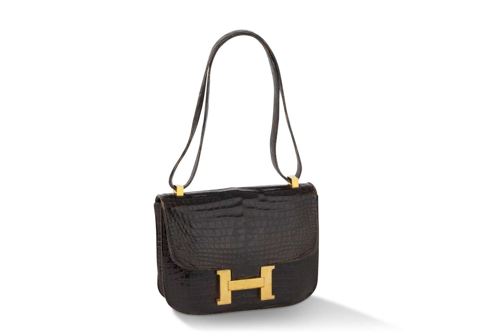 Sac en crocodile marron (Crocodylus porosus) Pré-convention I/A et garniture métal doré. Anse permettant un porté main ou épaule.