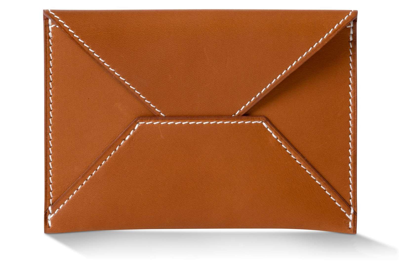 Porte-carte enveloppe en cuir marron et surpiqures blanches.