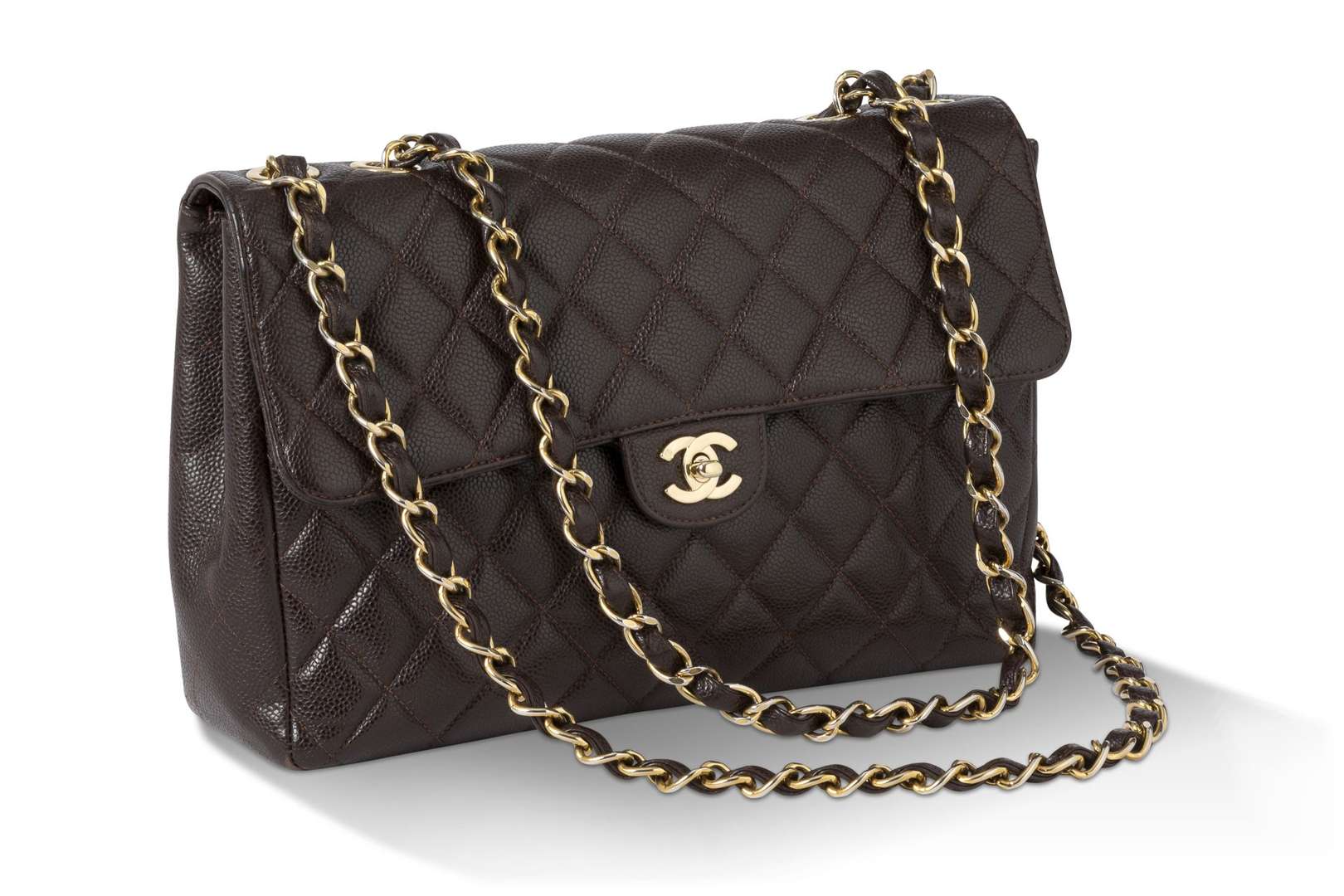 Sac en cuir grainé matelassé marron. Anse-chaine entrelacée de cuir marron et garniture en métal doré.