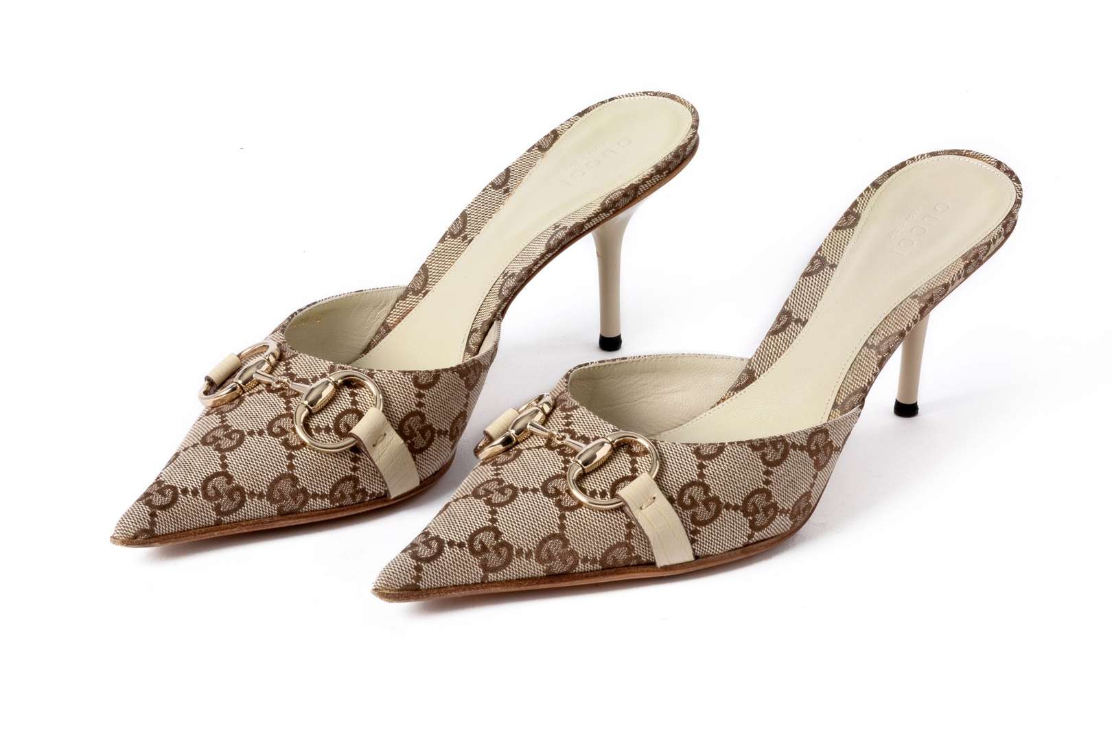 Paire d'escarpins en toile monogramée "GG" beige et marron, bouts pointus, Talons 8 cm env., semelle en cuir.