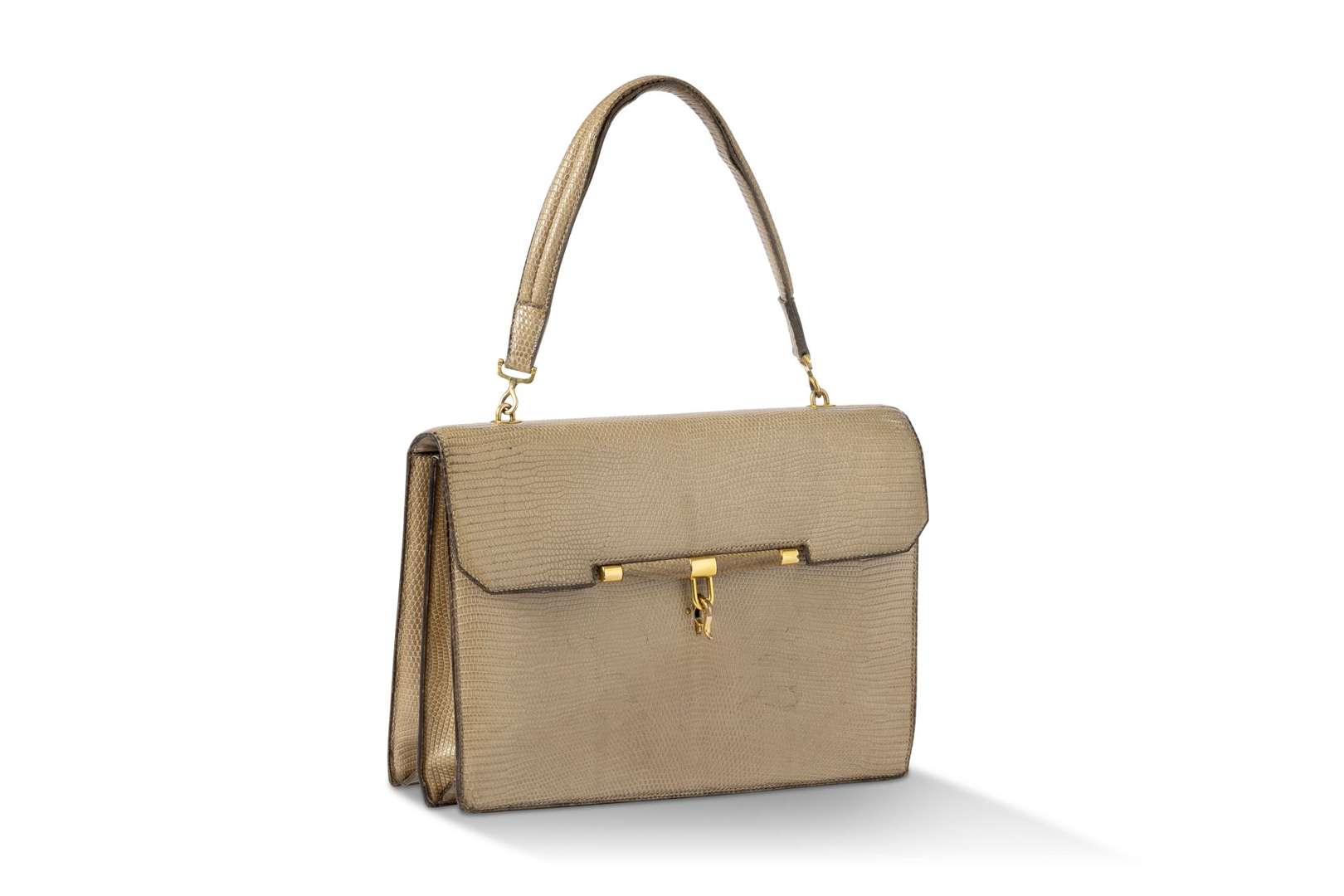 Sac en lézard beige, poignée en lézard et garniture en métal doré.