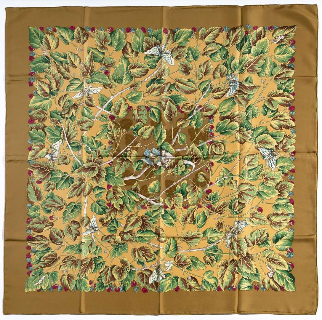 Carré de soie dessiné par Antoine de Jacquelot, dans les tons de marron et vert.