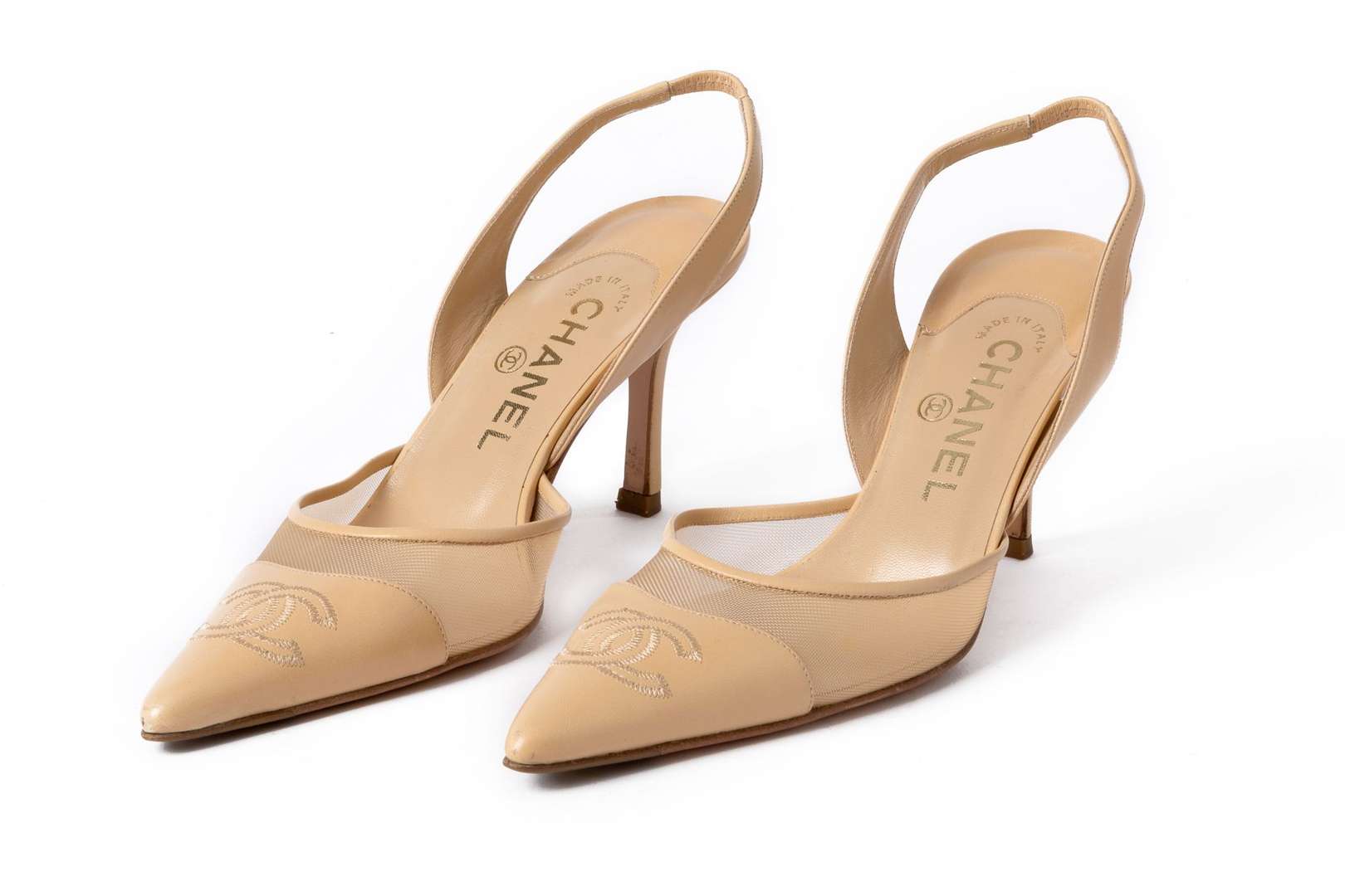 Paire d'escarpins "slingback", en toile et cuir beige, bouts pointus siglés