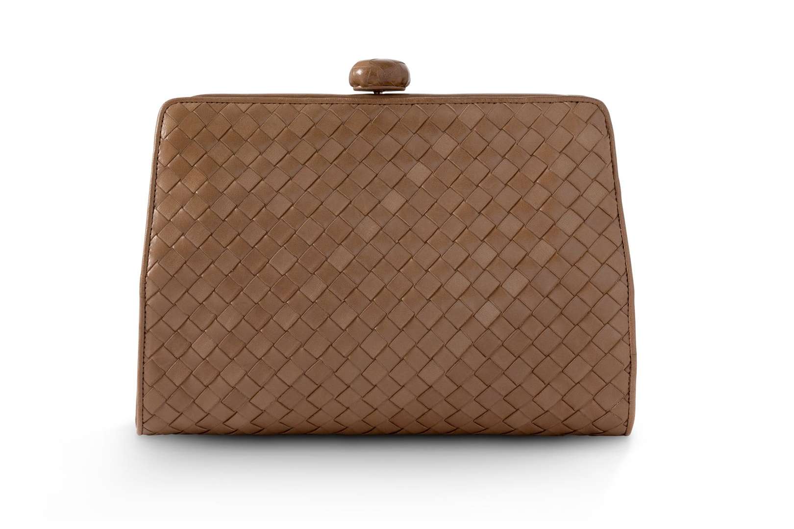 Pochette du soir en cuir brun intrecciato. Garniture en métal doré.