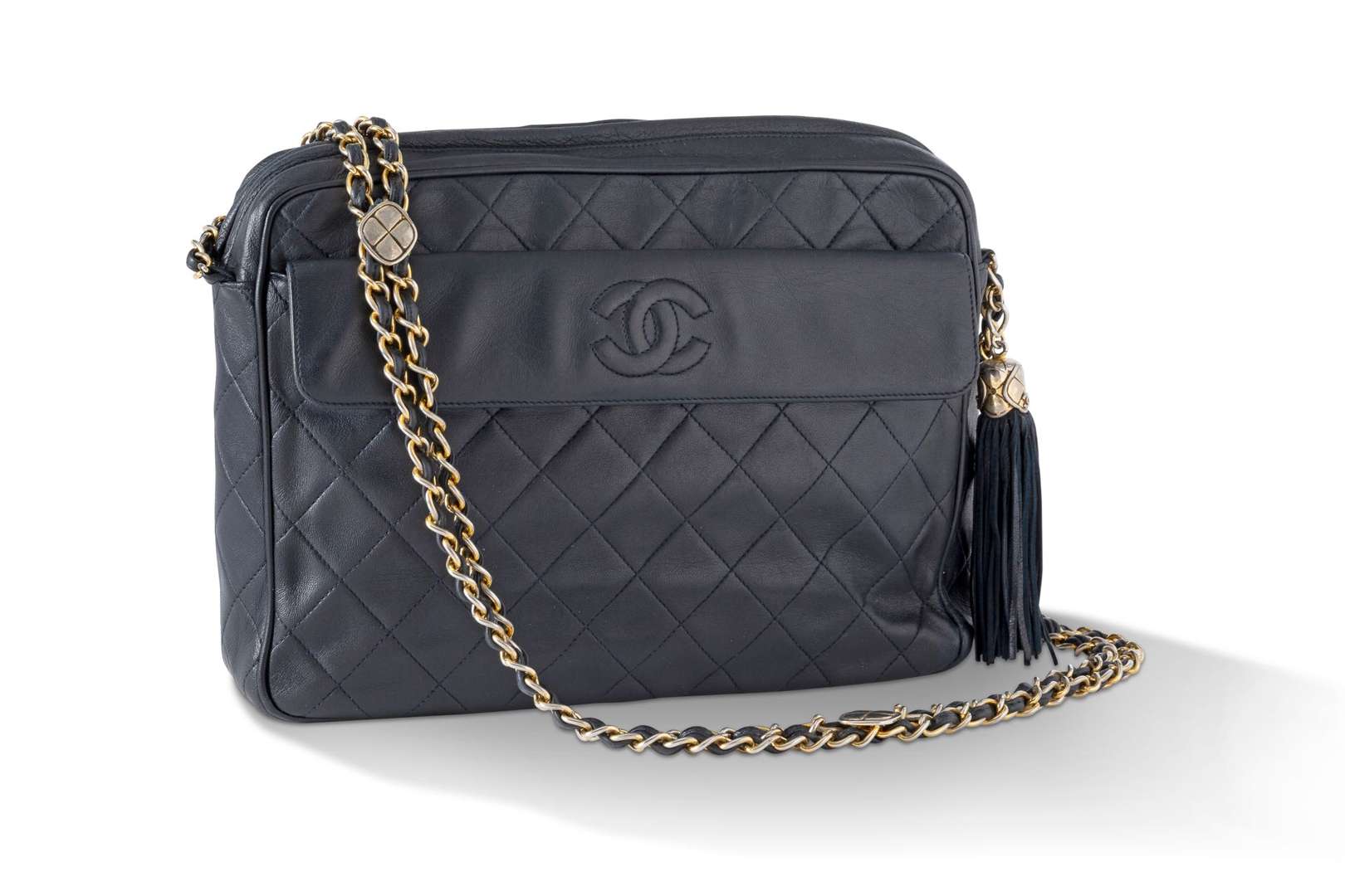 Sac en cuir matelassé bleu marine, anse-chaine en cuir et métal doré. Garniture en métal doré.