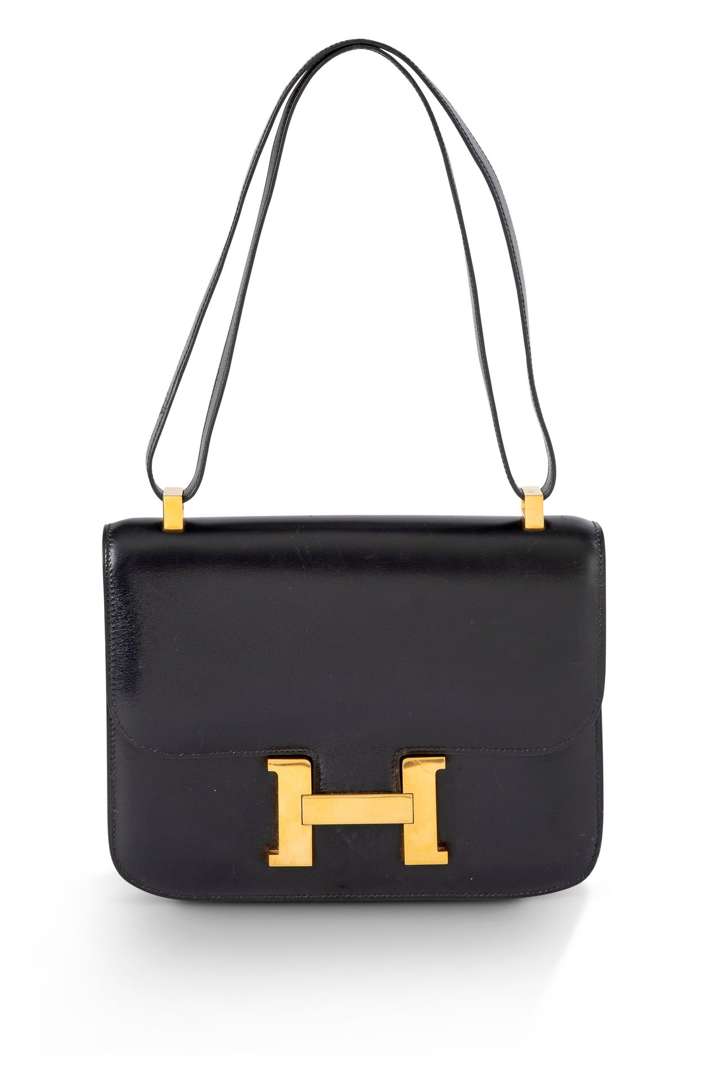 Sac en cuir box noir et garniture en métal doré. Bandoulière en cuir noir, poche plaquée au dos du sac.