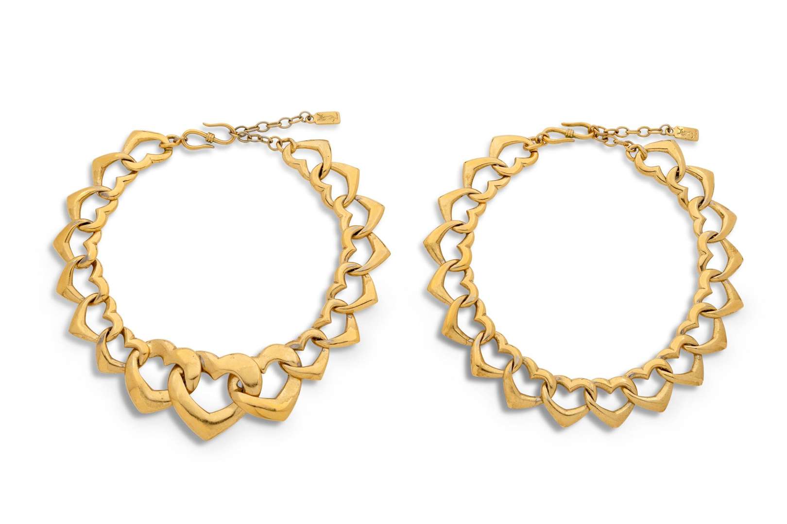 - Un collier en métal doré à motifs de coeurs entrelacés, signé YSL sur le fermoir. L. : 50 cm env.
