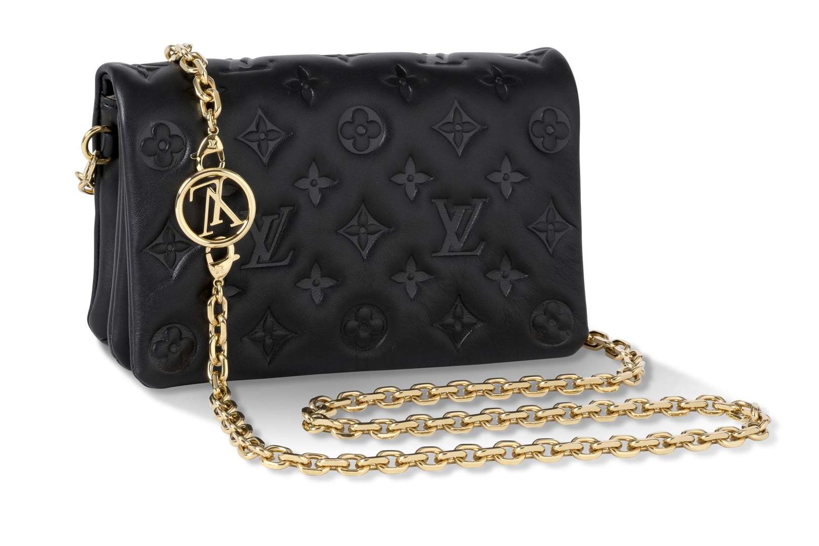 Sac matelassé monogrammé noir. Anse chaîne bandoulière amovible en métal doré. Garniture en métal doré.