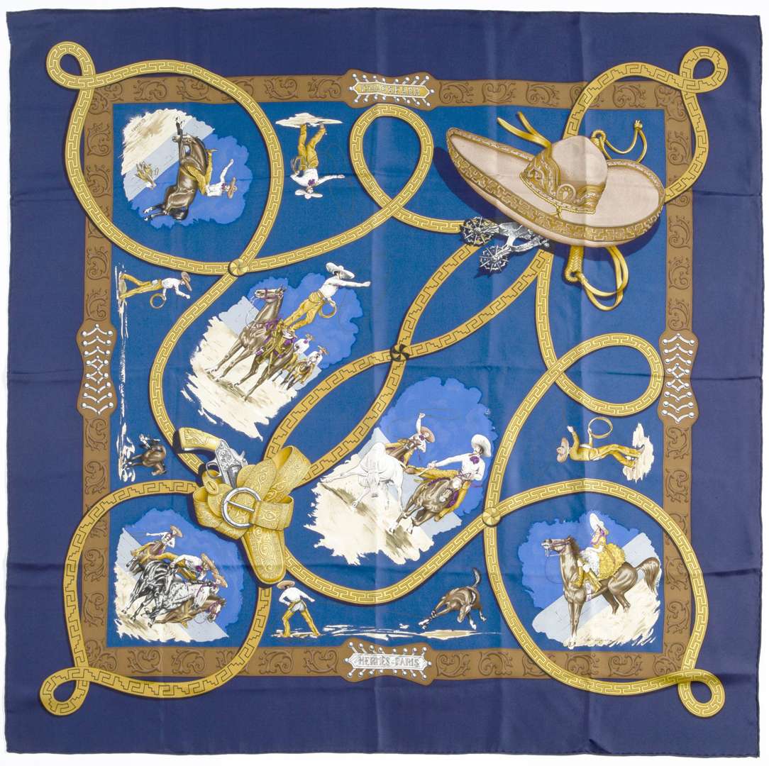 Carré de soie dessiné par Jean de Fougerolles, dans les tons de bleu marine et jaune.