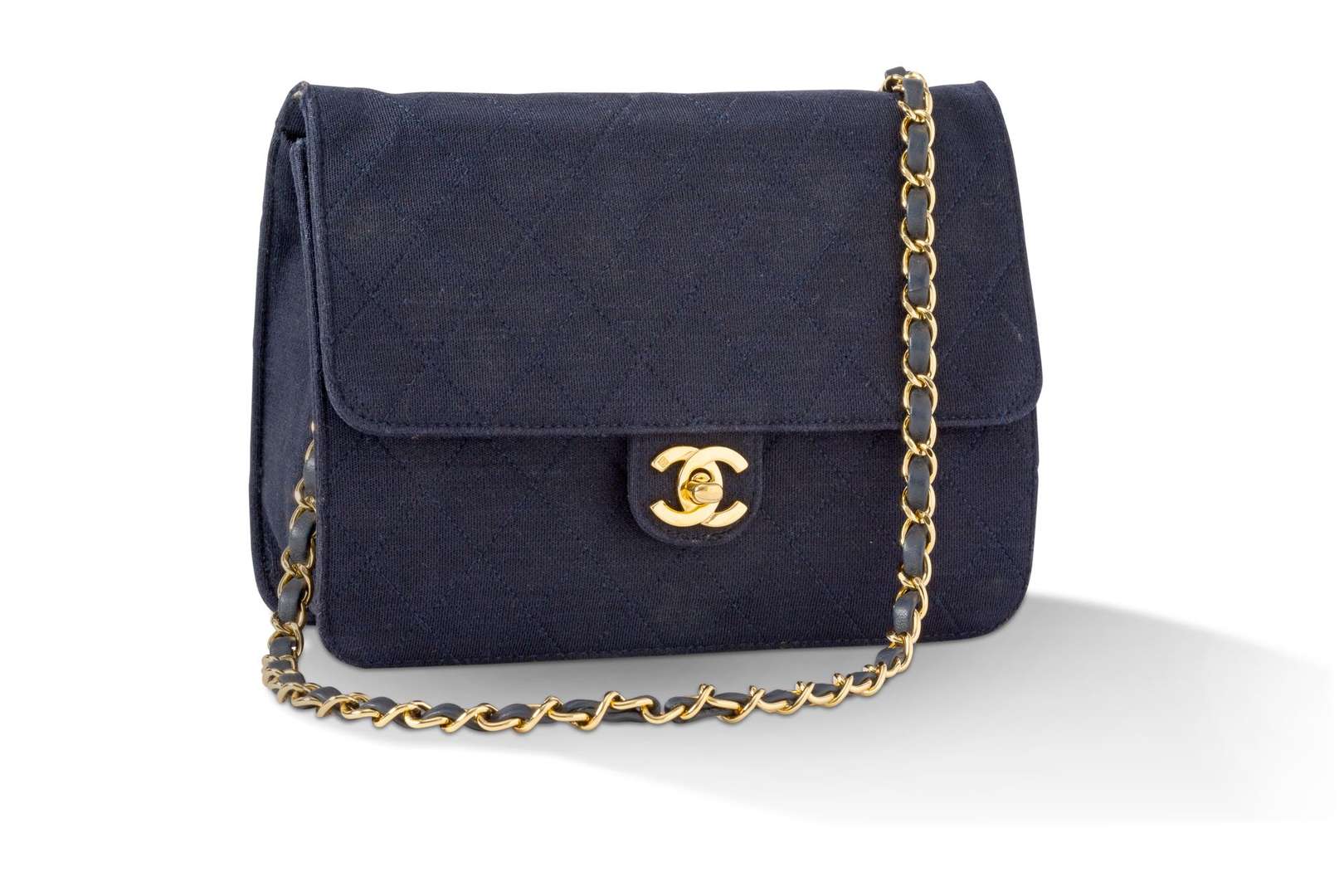 Sac en jersey matelassé bleu marine, anse-chaîne en cuir et métal doré. Garniture en métal doré.